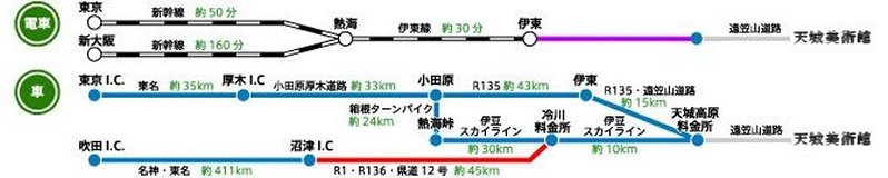 → 小田原 (箱根ターンパイク 約24km) → 熱海峠(伊豆スカイライン 約30km) → 冷川料金所 (伊豆スカイライン 約10km) → 天城高原料金所(遠笠山道路 約3.5km) |