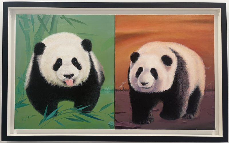 作品名称:城市的悲伤,自然的宁静:熊猫的选择 (Urban Sorrow, Natural Serenity: The Panda's Choice) 作品简介: 一只悲伤的熊猫代表了被污染的城市环境中生活的野生动物。它的神情悲伤和转身离开暗示了城市污染和破坏对野生动物的威胁。这种情感强调了环境对于生命的重要性。另一只熊猫在清新的自然环境中自在地吃竹子,代表了自然环境的宁静和和谐。这里的优美清新的自然背景反映了大自然的原始美和健康状态,为熊猫提供了一个宁静的庇护所。 这组油画作品以熊猫的形象和情感为媒介,通过对比城市和自然环境,传达了环境保护和野生动物保护的重要性,以及人类对这一问题的责任。 |